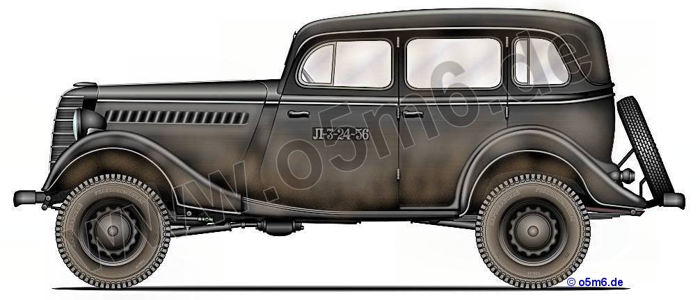 Note : The GAZ-61 appeared not only in civilian black but in Russian 4BO green as well, together with the typical cross.country tread tires.