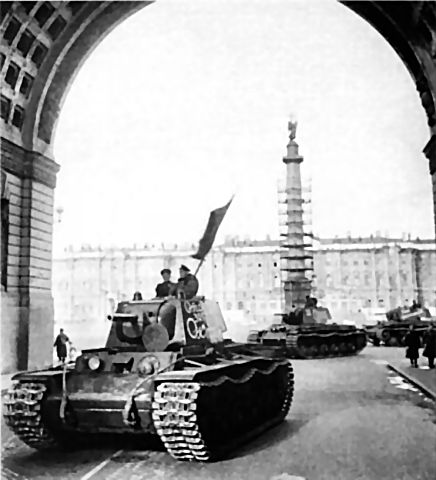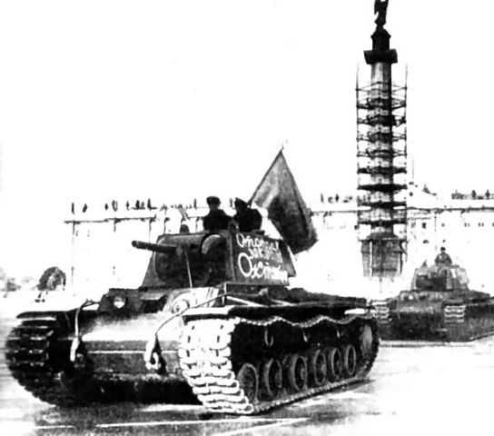 In fall of 1941, three tanks, freshly repaired, are on their way from the rpair shop parading through Palace Square with the Alexander column.