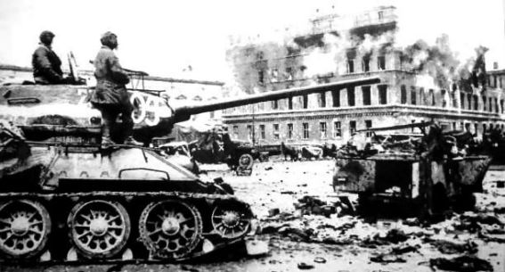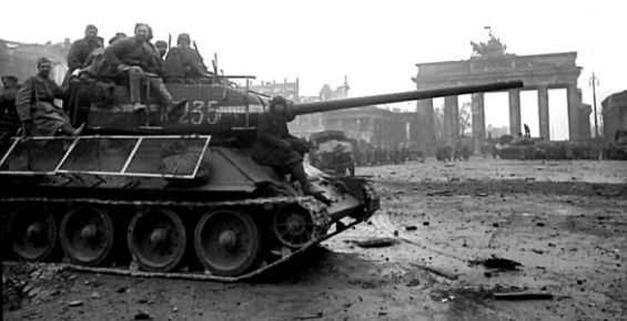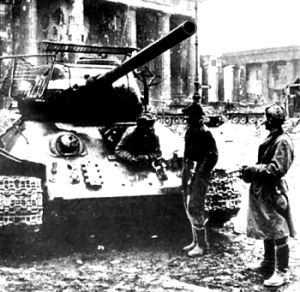 This T-34/85 of the 36th Tank Brigade, 11th Tank Corps, 1st Guards Tank Army, rests at the foot of the Brandenburg Gate in May 1945 following the capture of Berlin.