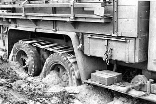 On both sides of the cargo body, brackets were holding the track links which could be fitted to the rear wheels in case of snow and heavy mud.