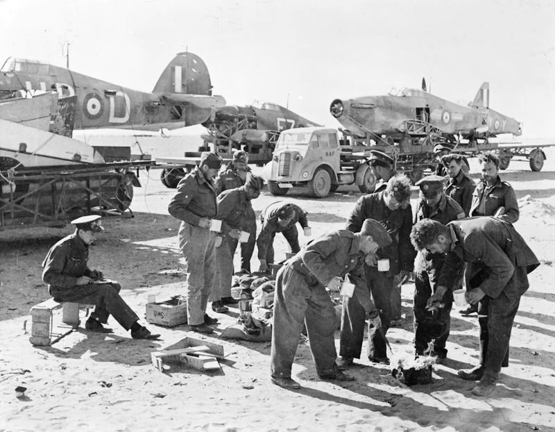 Personnel of No.53 Salvage and Repair Unit brew tea and stretch their legs in the Western Desert while transporting salvaged Hawker Hurricane IIB fuselages to Helwan, Egypt