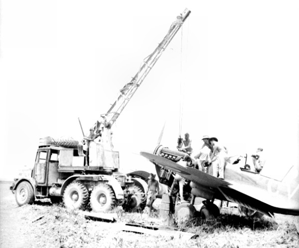 Hurricane Mark IIB R BD930 of 73 Squadron RAF being lifted onto 40-feet "Queen Mary" trailer