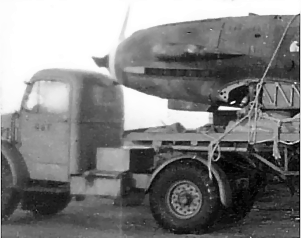 the fuselage of a Curtiss P40E "Kittyhawk Mk.I" on Tasker 40-feet "Queen Mary" semi-trailer