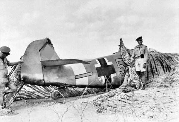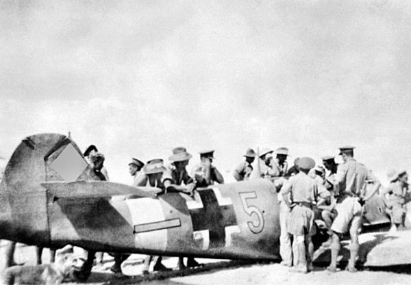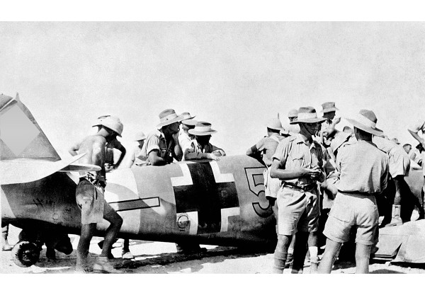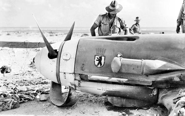 On August 12,1942, this German Messerschmitt Bf.109F plane made a forced landing on the main bitumen road near El Alamein Station when vitally hit by anti-aircraft fire. According to eye witnesses, "The pilot was so young he looked like a schoolboy, but stepped out un-injured after crash landing". Another Messerschmitt tried to "cannibalise" the "Yellow 5" with cannon fire to prevent parts being salvaged for examination by experts, and throughout the day reconnaissance flights were made over the area and vehicles and bystanders repeatedly strafed.