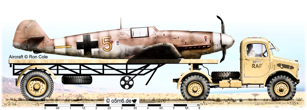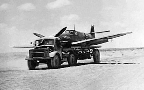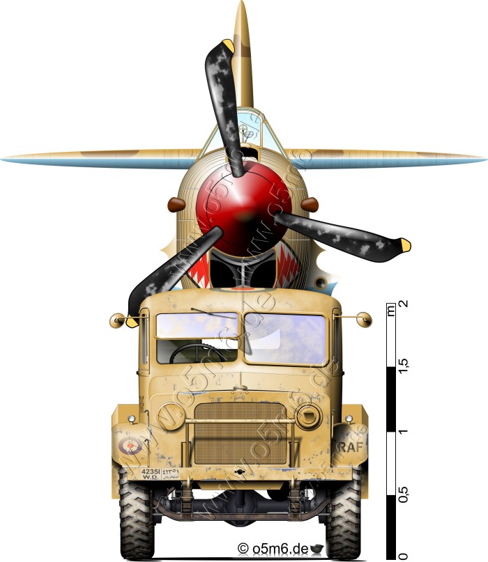 Curtiss P40E "Kittyhawk Mk.I" of 112 "Shark" Squadron RAF on Tasker "Queen Mary" semi-trailer