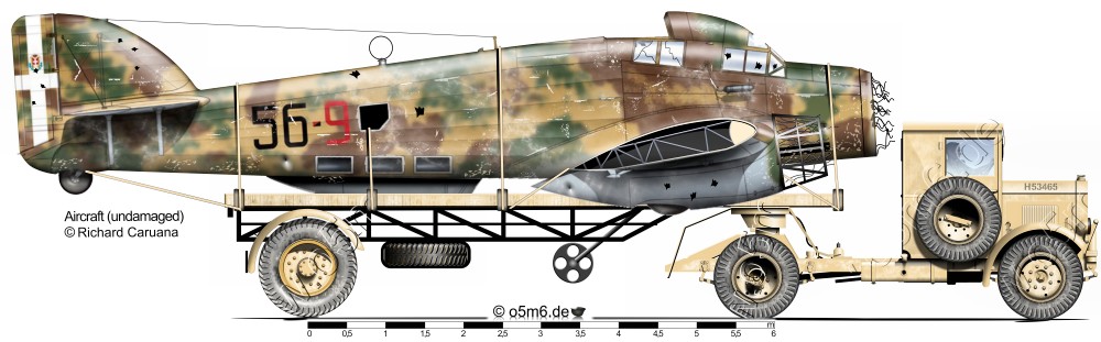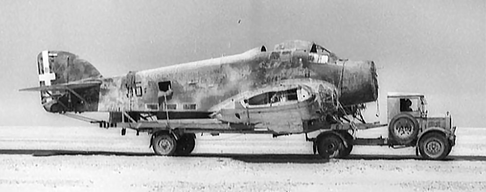 On August 17, 1940, a section of the Italian 56th BT Squadron (Stormo) attacked an English naval formation that disengaged after the bombing of Bardia. The SM79 of Lt. Arturo Lauchard (56-9) was hit by the Sea Gladiators taken off from the HMS Eagle and lone Hurricane, and landed in an emergency on the Egyptian coast in the hands of the enemy. The commander, his deputy Lt. Ceard and the S.Ten. Rossi was taken prisoner, while the rest of the crew, Avieri chosen Sulas, Foschi and Mattarozzi, was killed. The carcass of the plane with no less than 600 bullet holes in it was dragged to Alexandria and exhibited in the Ismailia square.
