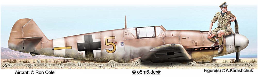 Messerschmitt Bf.109F-4/trop (tropical variant), W.Nr.10074, Yellow 5 of 6/JG27 (a Berlin Luftwaffe unit. hence the Berlin bear embleme), piloted by Lieutenant (Leutnant) Gerhard "Gert" Mix.