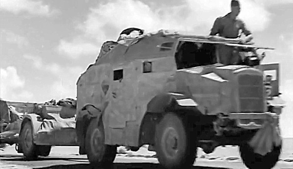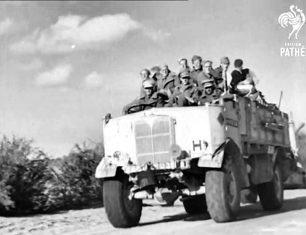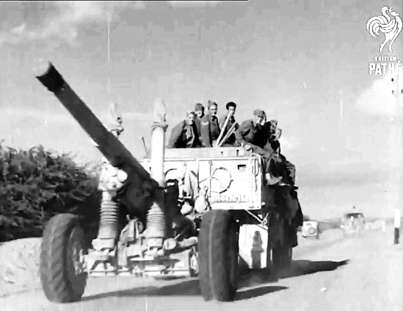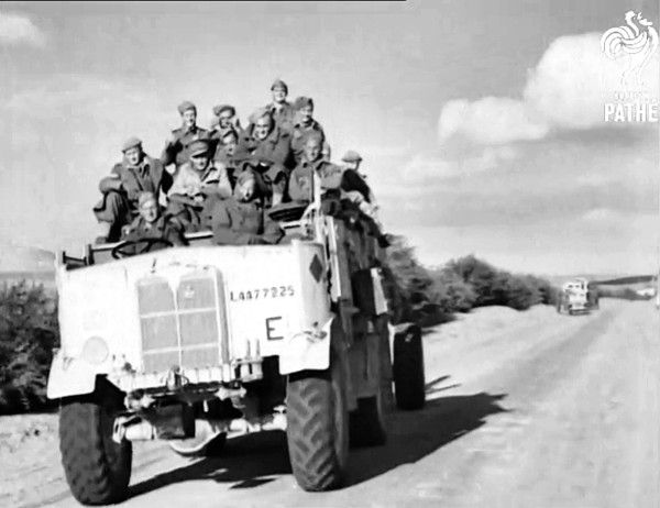 Newsreel shots of a Morris/25pdr column passing the war correspondent